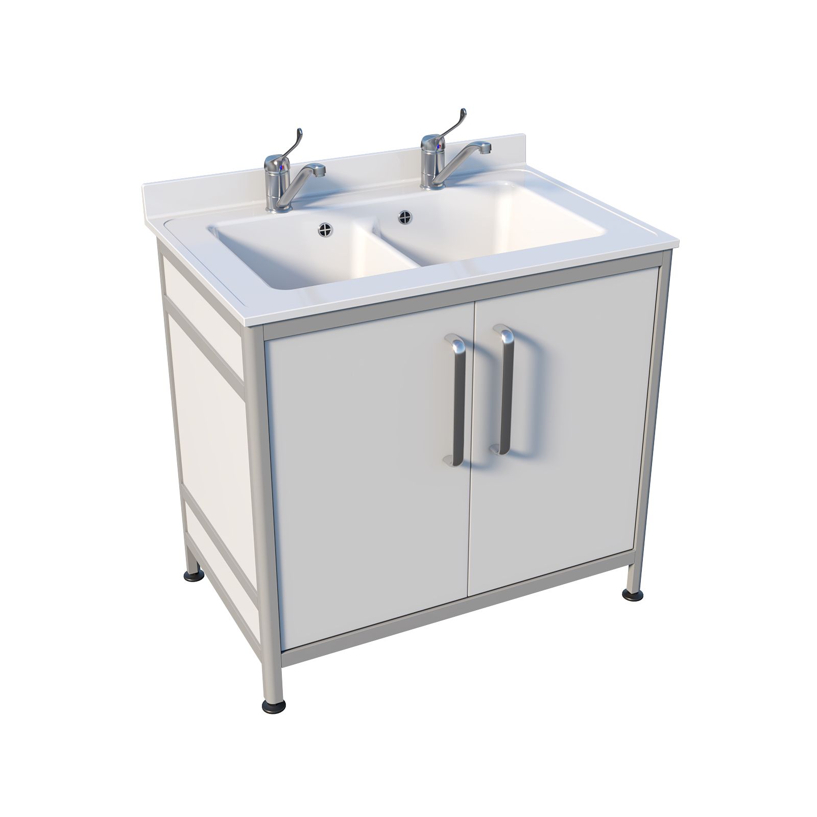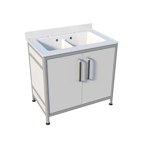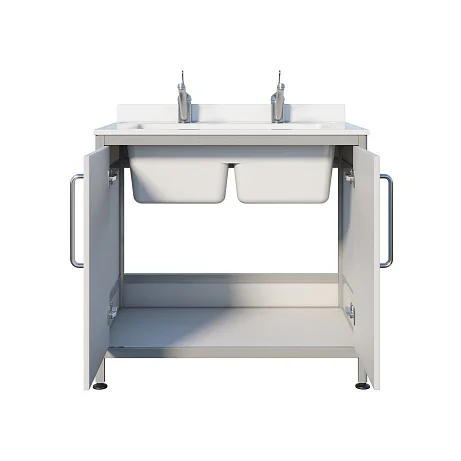 Основа конструкции выполнена из алюминиевого профиля, а белая пластиковая обшивка аккуратно выглядит и удобна в уходе. Накладная двухчашевая мойка из литьевого мрамора дает возможность разделять процессы: например, замачивание и ополаскивание, подготовку и финальную промывку. Тумба закрывается двумя распашными дверцами, внутри удобно хранить моющие средства и принадлежности, не оставляя их на виду. Ножки являются продолжением алюминиевого каркаса, что добавляет устойчивости. Над каждой чашей предусмотрен хирургический локтевой смеситель — гигиеничное решение для работы с медицинским инструментарием.
