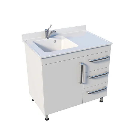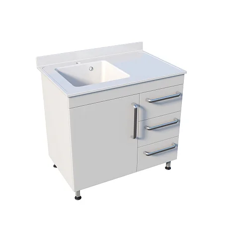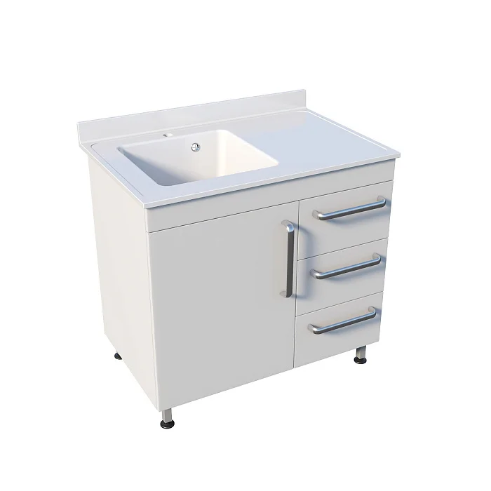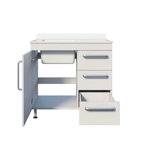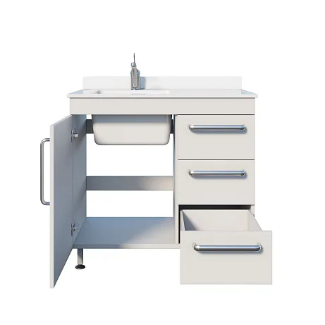 Под чашей предусмотрено отделение с распашной дверью — удобно для размещения коммуникаций, ёмкостей, бытовой химии, средств ухода или контейнеров (в соответствии с внутренними регламентами учреждения). Справа под рабочей поверхностью три одинаковых выдвижных ящика. Такой формат хорошо подходит для «быстрой логистики» кабинета: в верхний ящик часто кладут перчатки/салфетки/пакеты, во второй — инструменты и лотки, в третий — запасные расходники. Одинаковый размер ящиков упрощает распределение и перестановку содержимого.