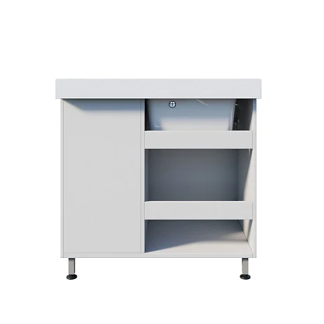 Корпус выполнен из ЛДСП, а мойка и рабочая поверхность изготовлены из литьевого мрамора — материала, который ценят за монолитность и удобство в уходе. Под чашей предусмотрено отделение с распашной дверью для хранения расходников и моющих средств. Справа расположена дополнительная рабочая зона, а под ней — три одинаковых выдвижных ящика для систематизации мелких инструментов и принадлежностей.