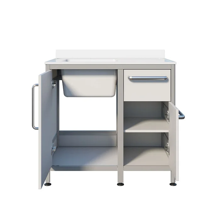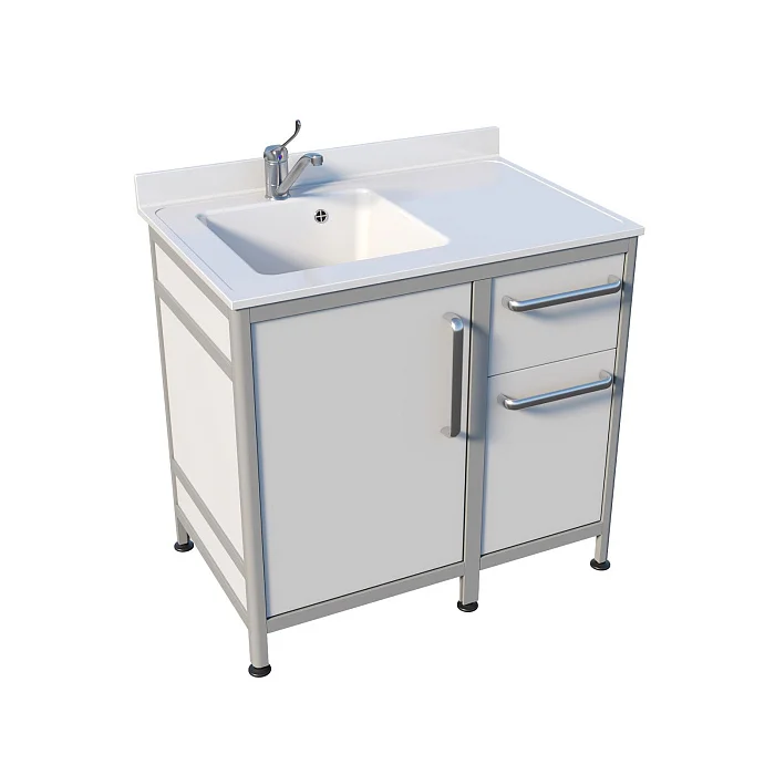 Для хранения предусмотрены продуманные секции: под чашей находится отделение с распашной дверцей, а под рабочей зоной — один выдвижной ящик и отдельное отделение с дверцей. Внутри установлена полка, чтобы мелочи не терялись и всё было разложено по местам. Ножки выполнены как продолжение алюминиевого профиля, что добавляет конструкции собранности и устойчивости. Комплектуется хирургическим локтевым смесителем — удобно, когда руки заняты или требуется минимизировать контакт.