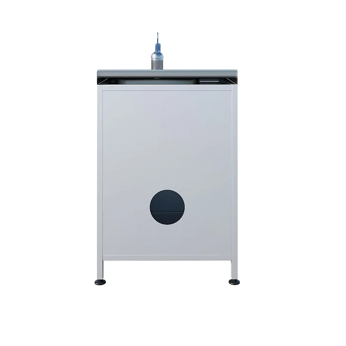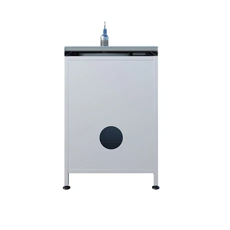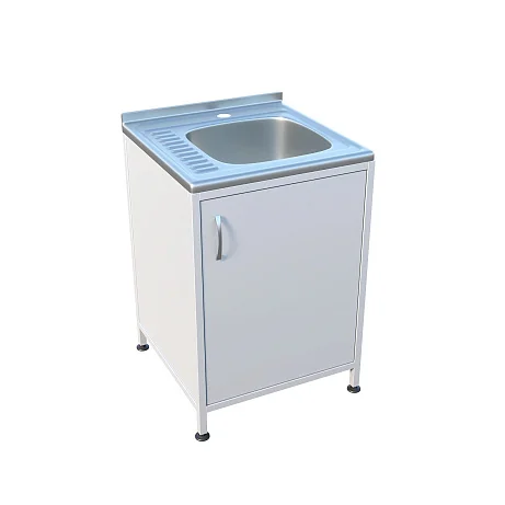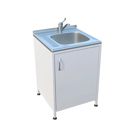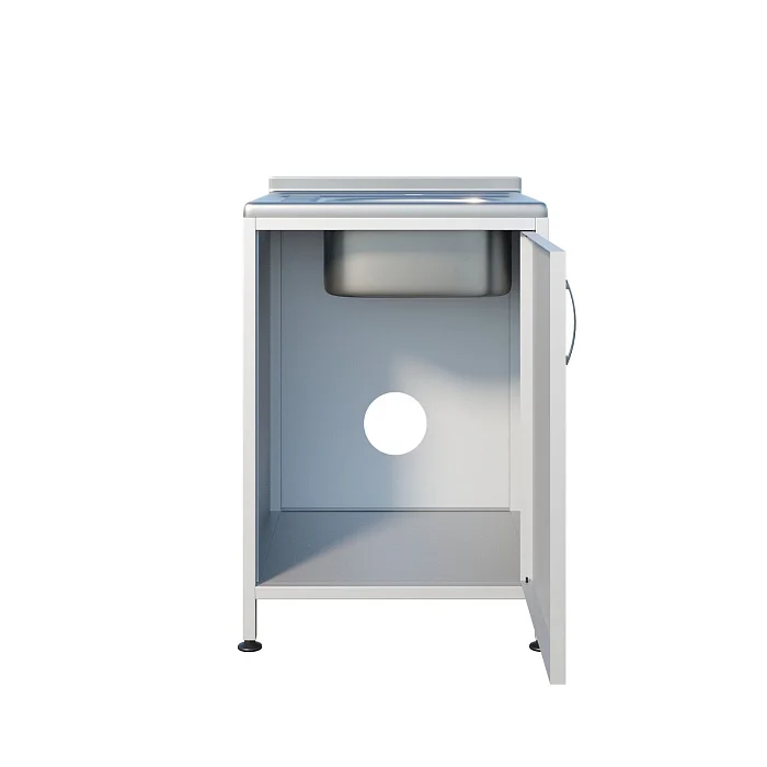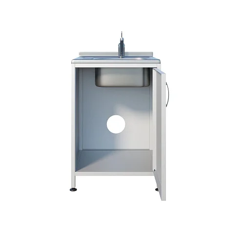 Сверху установлена накладная раковина с небольшой рабочей поверхностью из нержавеющей стали. Такой формат удобен, когда необходимо разместить рядом инструмент, лоток или емкость, не занимая отдельный стол. Под мойкой предусмотрено отделение с распашной дверцей — для хранения расходных материалов, моющих средств (в рамках принятых у вас регламентов), контейнеров или инвентаря для быстрой работы у точки водоснабжения.