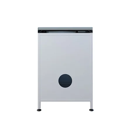 Каркас и корпус тумбы металлические, с белым порошковым покрытием. Накладная мойка из нержавеющей стали дополнена компактной рабочей площадкой. Под чашей предусмотрено закрытое отделение с распашной дверцей — всё нужное можно держать под рукой, сохраняя аккуратный внешний вид рабочей зоны.