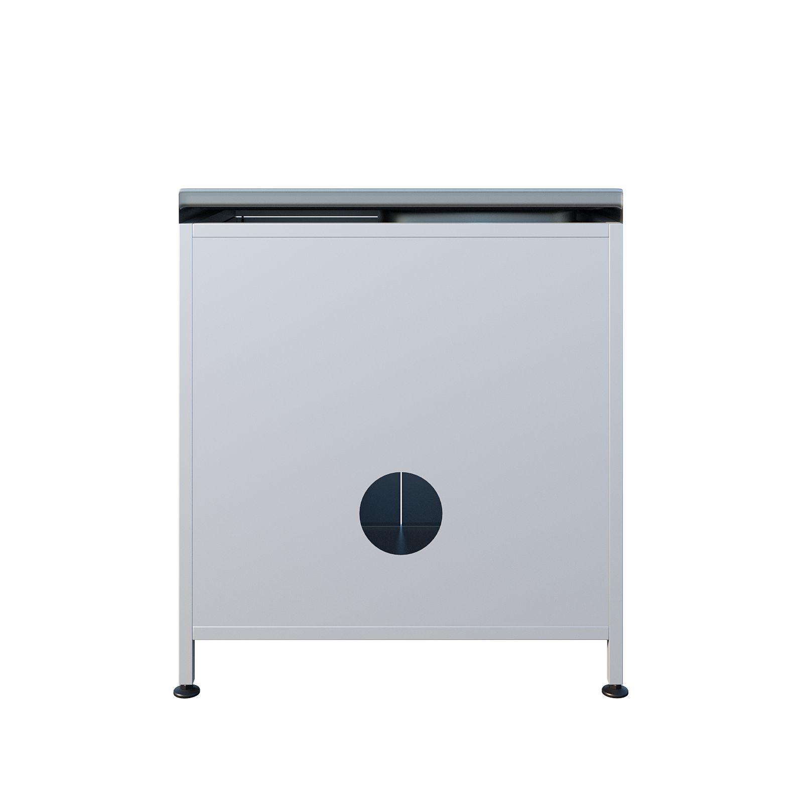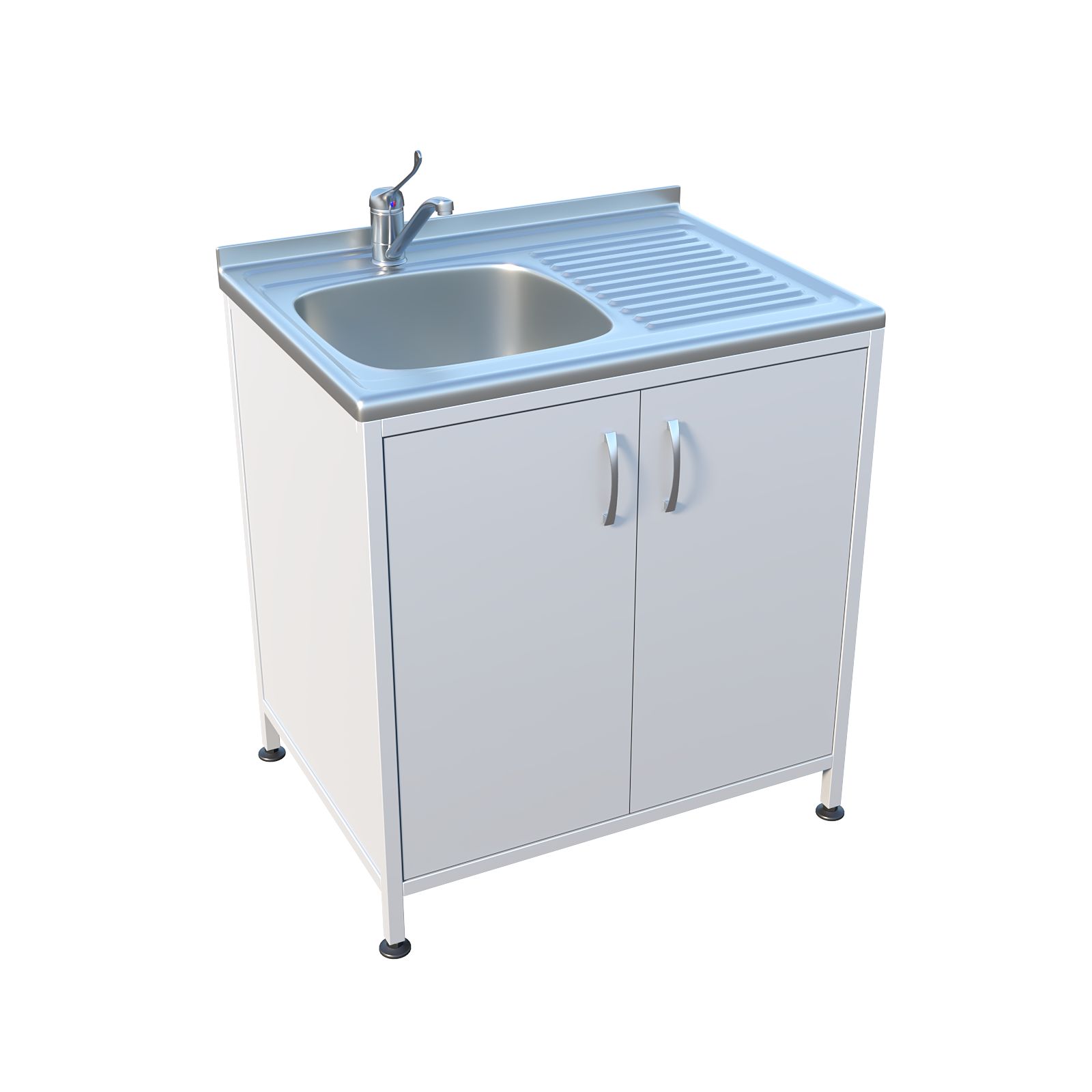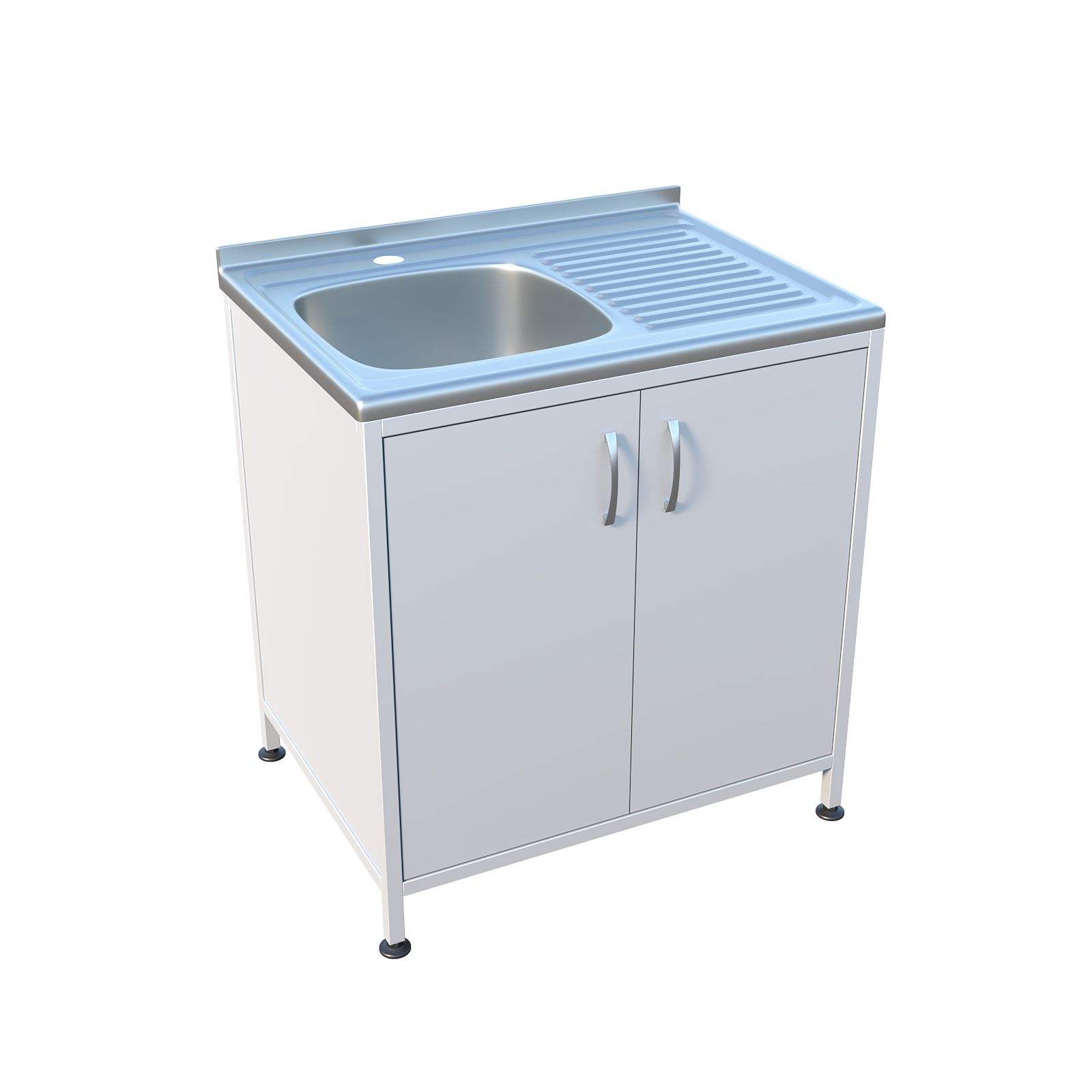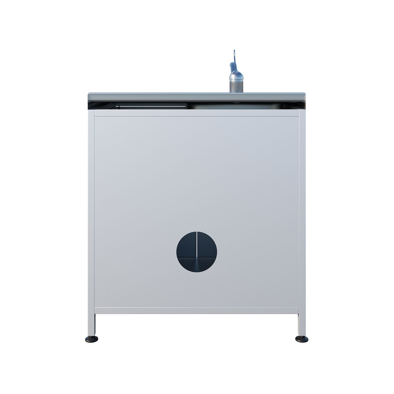 Конструкция выполнена на прочном металлическом каркасе: корпус тумбы окрашен белой порошковой краской, устойчивой к ежедневной нагрузке. Накладная мойка из нержавеющей стали дополнена рабочей поверхностью справа — удобно разместить инструменты и расходные материалы, не загромождая чашу. Под мойкой предусмотрено закрытое отделение с распашными дверцами для хранения принадлежностей и поддержания порядка.