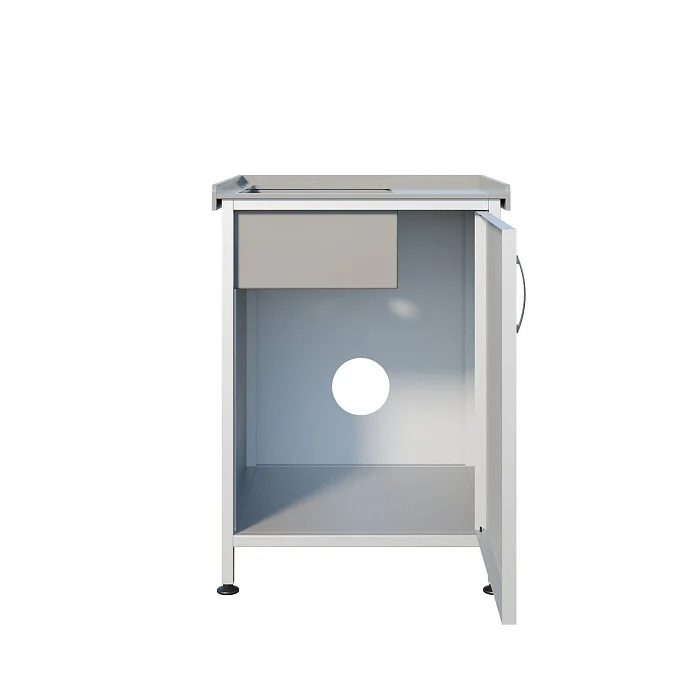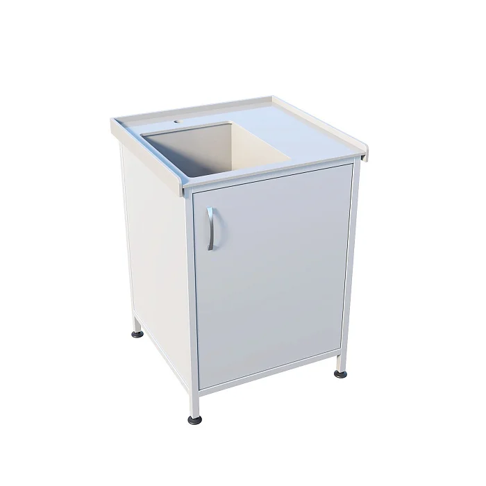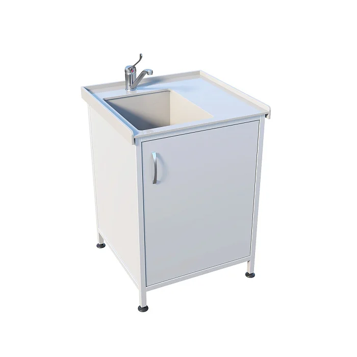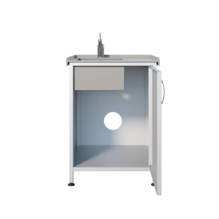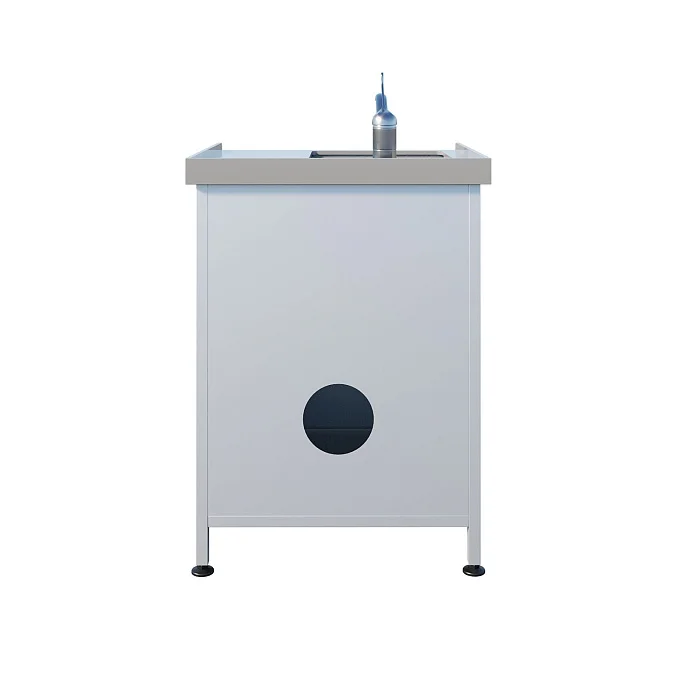 Под мойкой находится отделение с распашной дверцей — удобно хранить расходные материалы и поддерживать порядок рядом с зоной обработки. Для соблюдения санитарных требований установлен хирургический локтевой смеситель, позволяющий управлять водой без лишних касаний. Регулируемые по высоте опоры помогают ровно выставить мойку даже на неидеальном полу.
