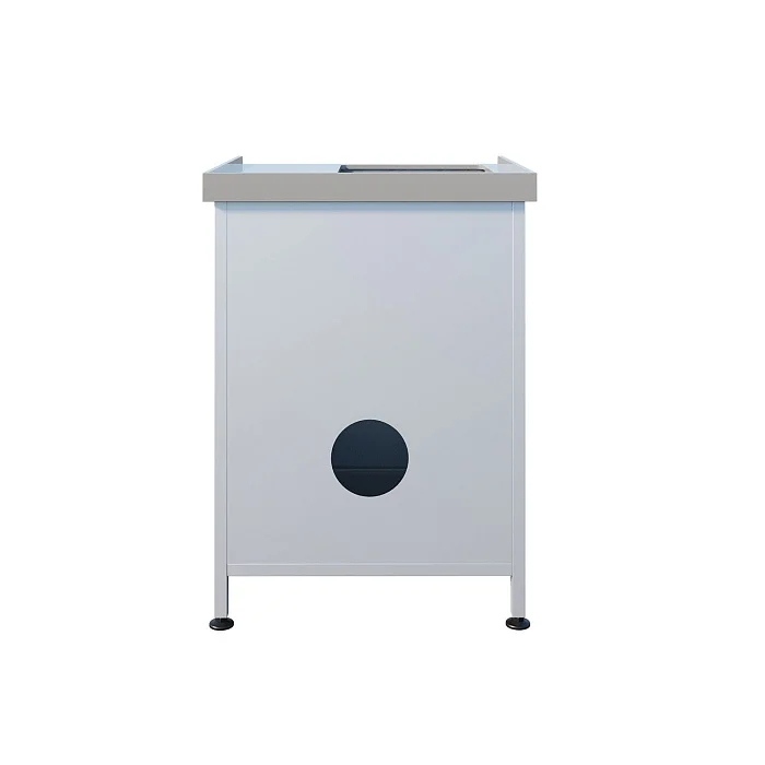 Каркас и корпус тумбы выполнены из металла и окрашены белой порошковой краской. Такой тип покрытия ценят за ровную поверхность и стойкость к повседневной эксплуатации: мойка выглядит аккуратно, легко вписывается в интерьер медицинского кабинета и упрощает поддержание опрятного вида рабочей зоны.
