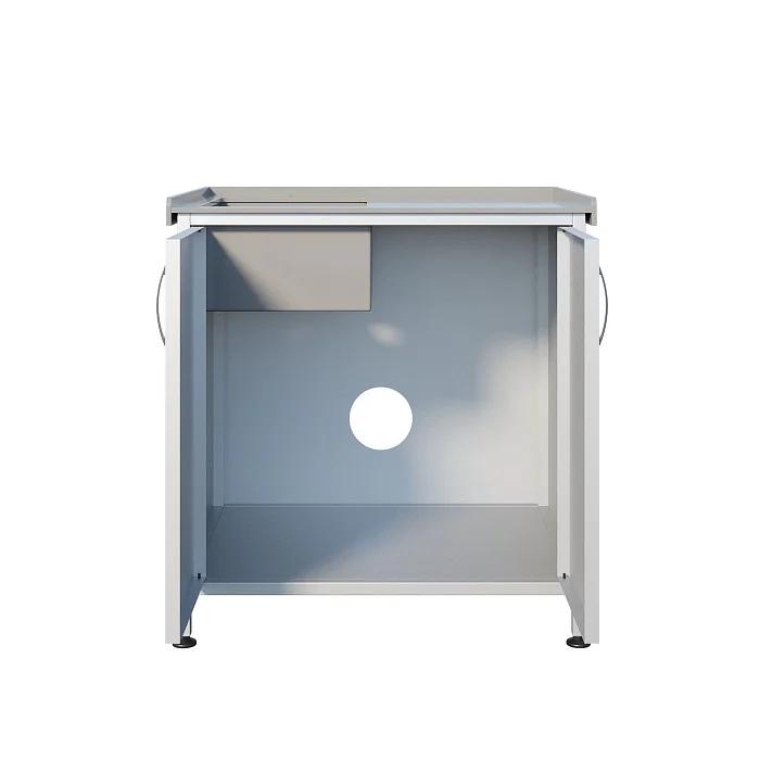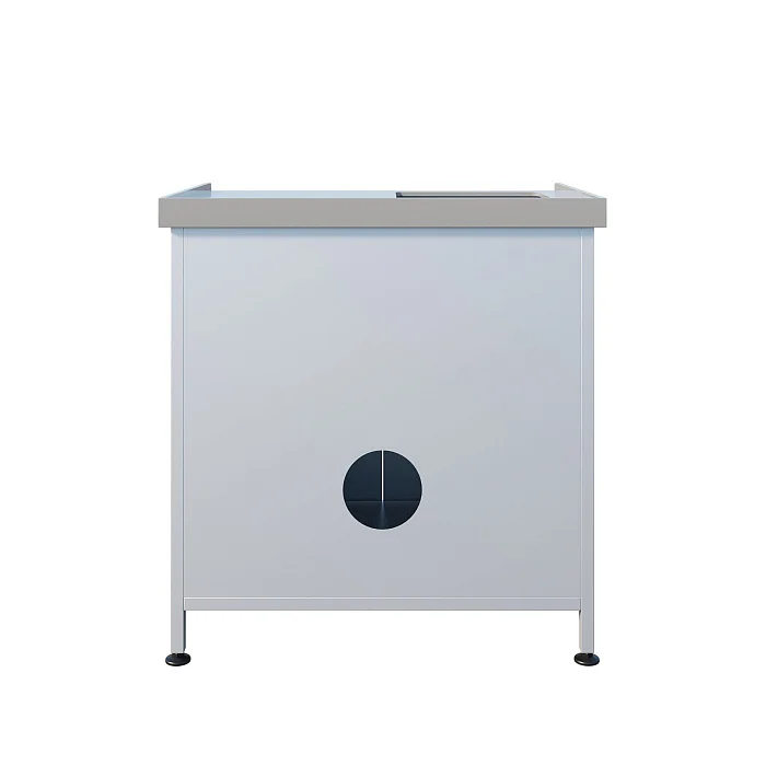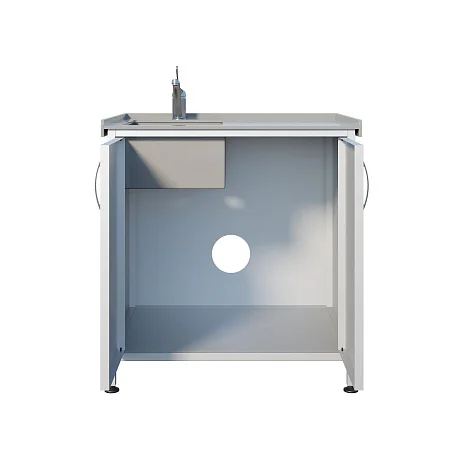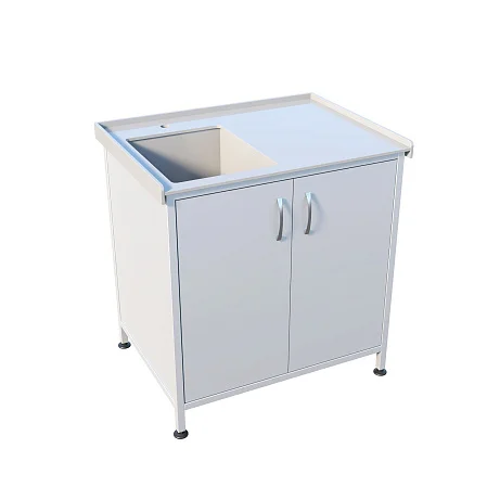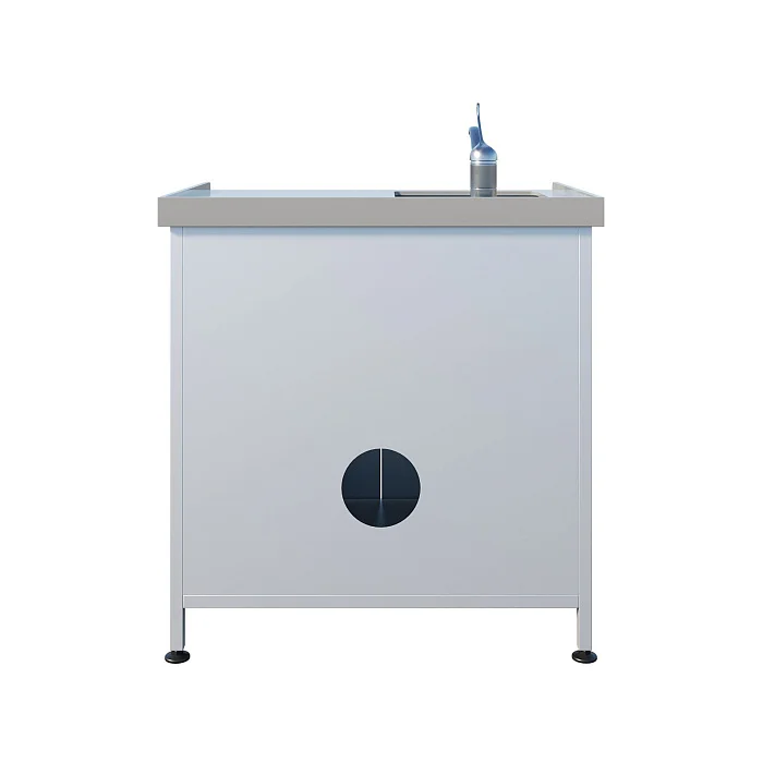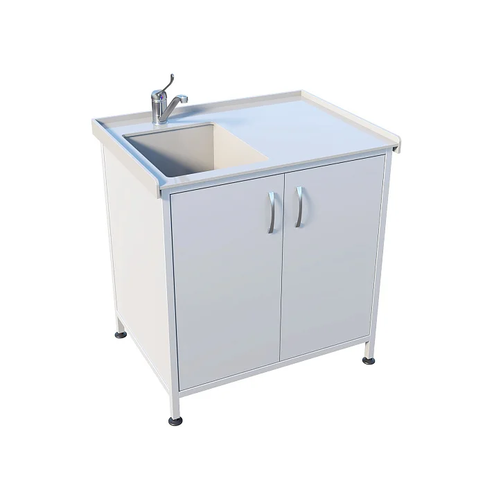 Каркас и корпус тумбы выполнены из металла и окрашены белой порошковой краской — покрытие рассчитано на повседневную эксплуатацию. Накладная мойка из полипропилена дополнена рабочей поверхностью справа, чтобы всё необходимое было под рукой. Под мойкой со столешницей предусмотрено отделение с распашными дверцами для хранения расходников и принадлежностей. Для соблюдения гигиены установлен хирургический локтевой смеситель, а регулируемые по высоте опоры помогают ровно выставить мойку даже на неровном полу.
