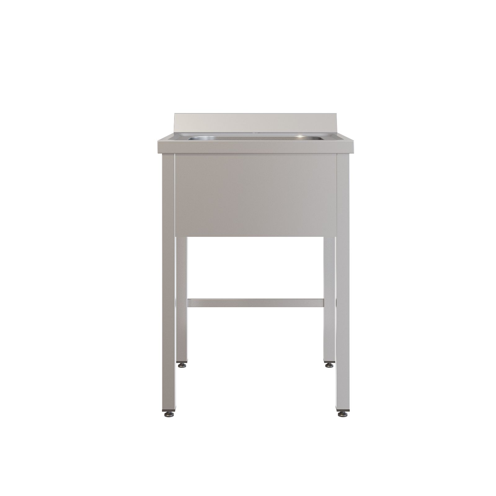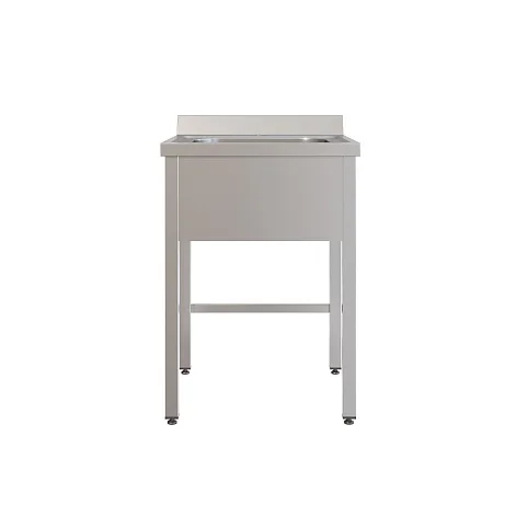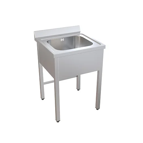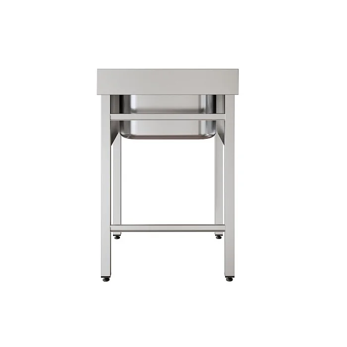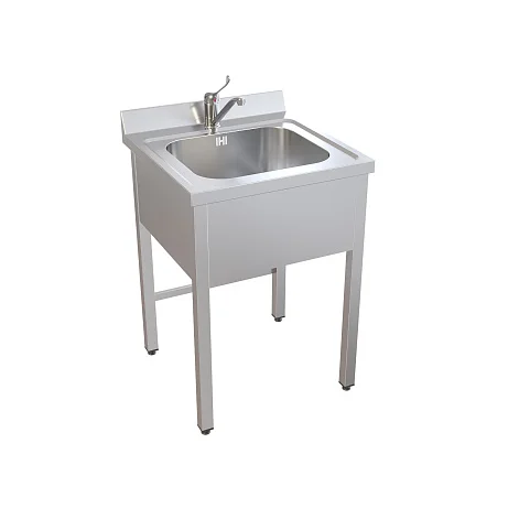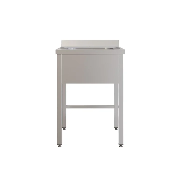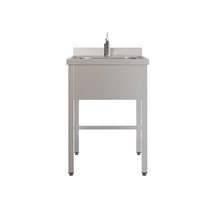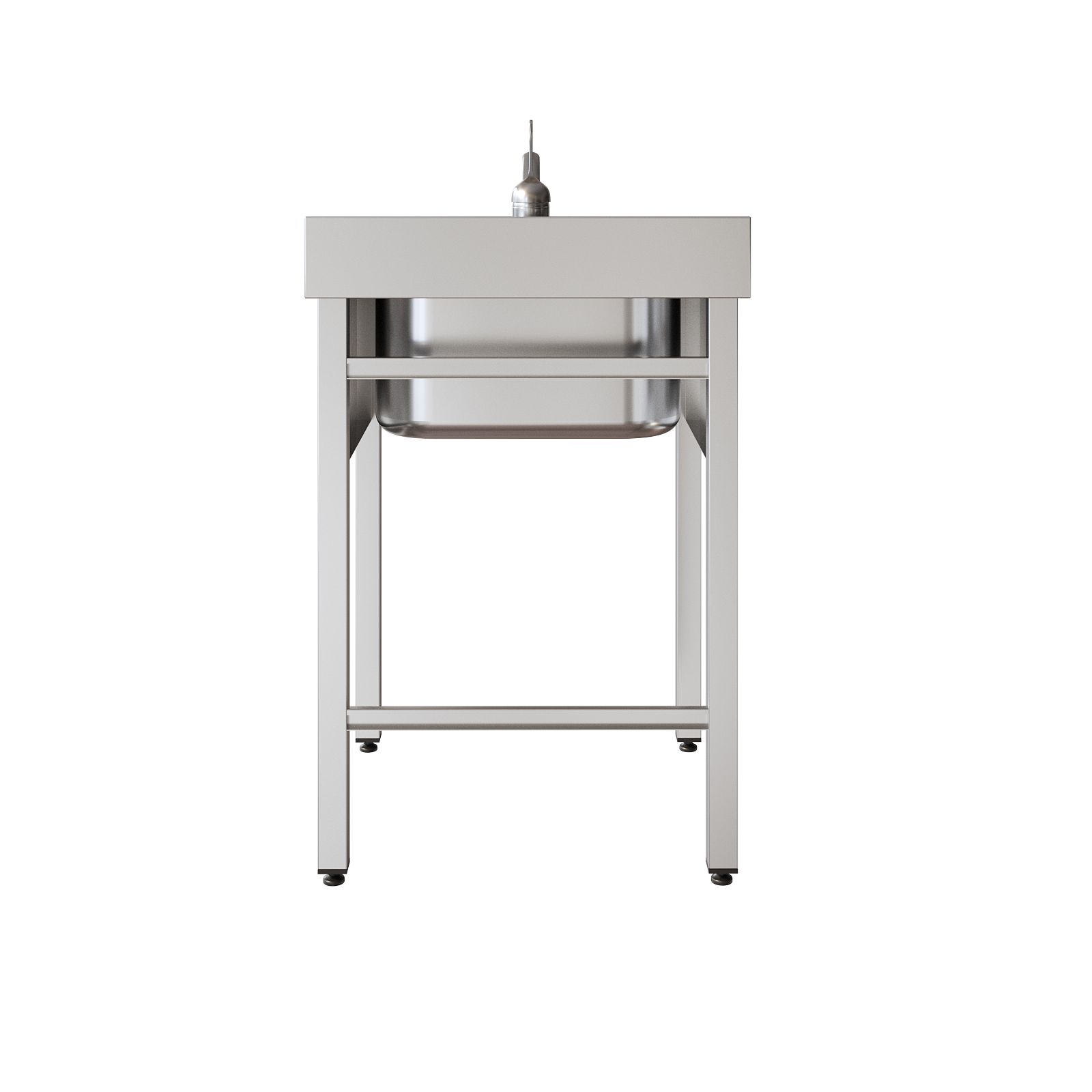Конструкция полностью выполнена из нержавеющей стали AISI 304: прочный каркас из сварной трубы и одночашевая раковина с пристенным бортом устойчивы к интенсивной эксплуатации и регулярной обработке. Фартук закрывает мойку с трёх сторон, а с тыльной части установлены две перемычки, которые добавляют жёсткости и стабильности. Для комфортной и гигиеничной работы предусмотрен хирургический локтевой смеситель, а регулируемые по высоте опоры позволяют точно выставить мойку по уровню даже на неровном полу.