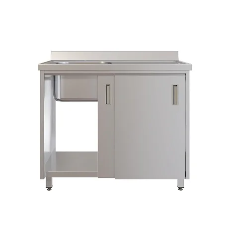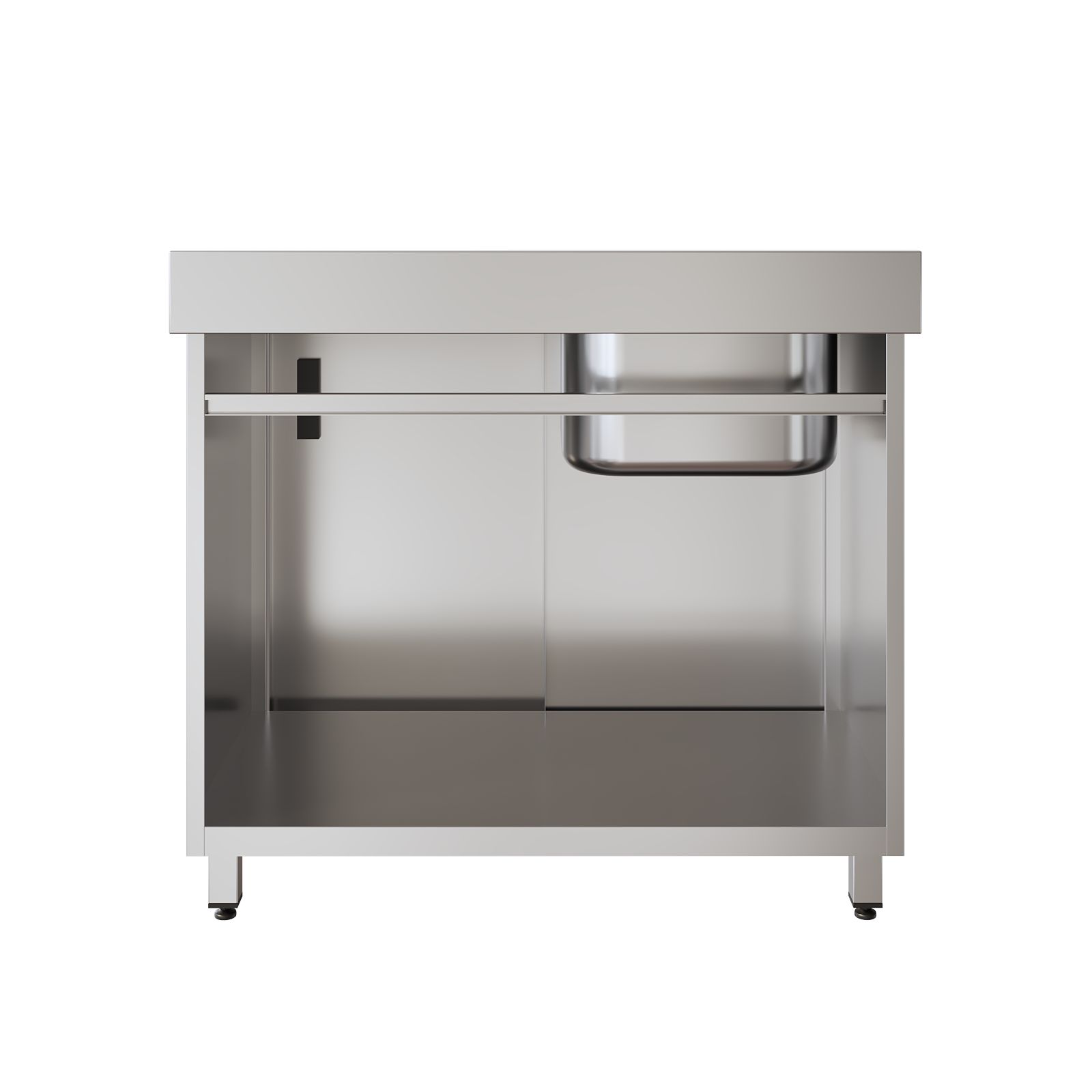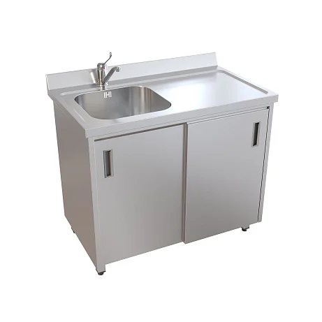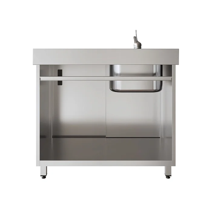 Модель выполнена как удобный моечный пост: одночашевая раковина, справа — столешница, под моечной зоной — закрытое отделение. Двери-купе экономят пространство перед мойкой: это особенно ощутимо в небольших моечных, процедурных и лабораторных, где важен каждый сантиметр прохода.