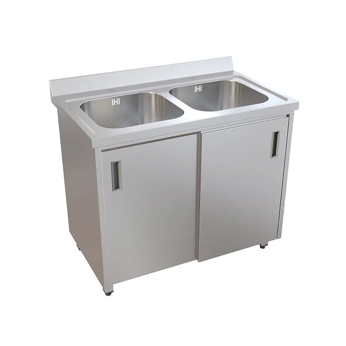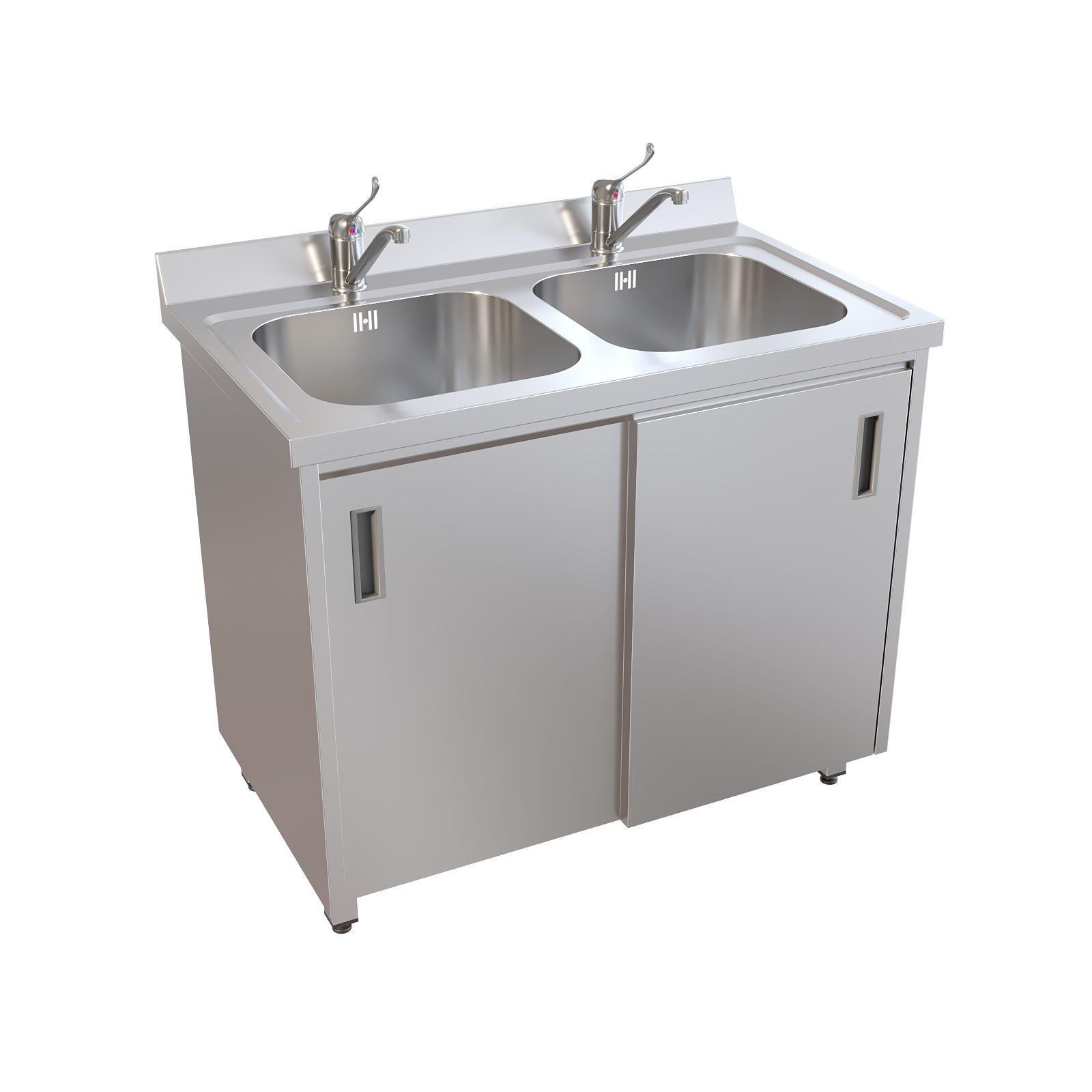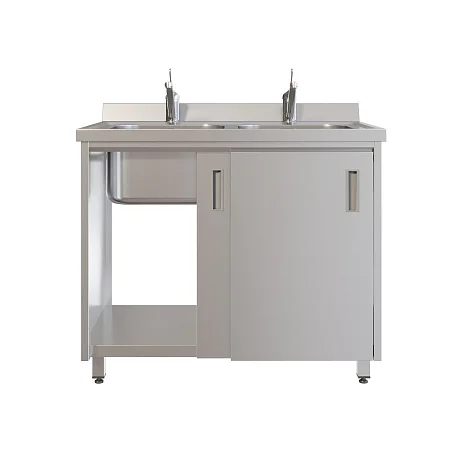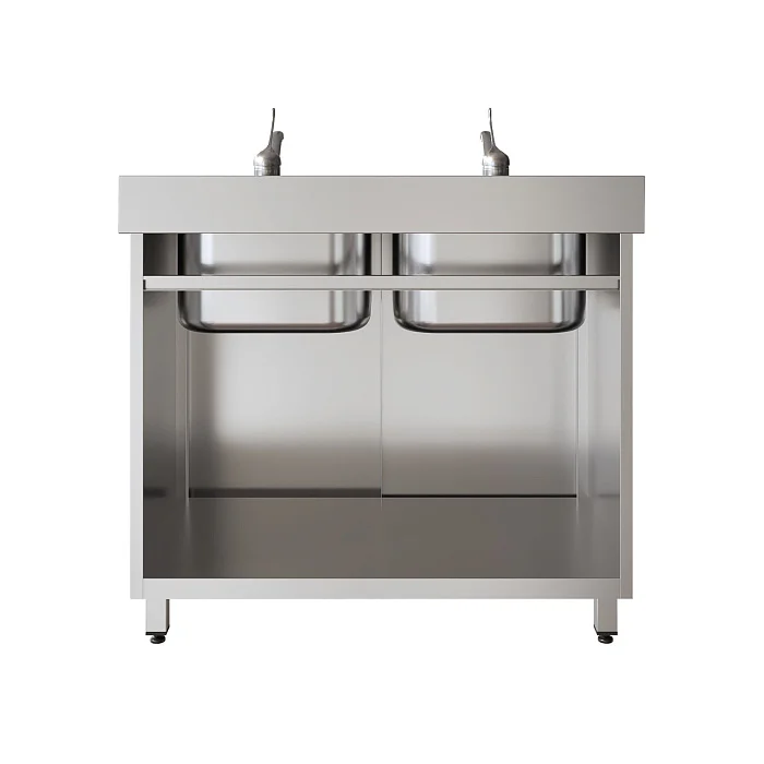 Конструкция полностью выполнена из нержавеющей стали AISI 304, устойчивой к ежедневным нагрузкам и регулярной санитарной обработке. Двухчашевая раковина с пристеночным бортом помогает организовать работу по этапам и аккуратно держать рабочую зону возле стены. Под мойкой предусмотрено закрытое отделение с дверями-купе для хранения необходимого инвентаря и расходных материалов. Для быстрого и безопасного доступа к воде установлены хирургические локтевые смесители над каждой чашей, а регулируемые по высоте опоры позволяют точно выставить мойку по уровню на месте установки.