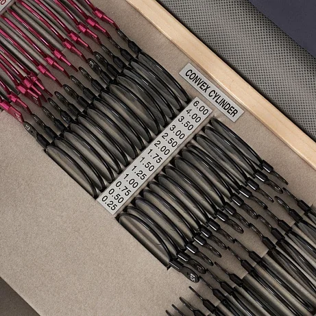 Утомляет не пациент, а поиск нужной линзы. В наборе Армед сделан упор на понятную идентификацию: на рукоятке каждой линзы нанесено номинальное значение оптической силы, на ободках астигматических линз — направление главного сечения нулевого действия линзы/призмы, а на рукоятках дополнительных элементов — условное обозначение. Это снижает риск путаницы при последовательных пробах и помогает поддерживать единый стандарт работы у нескольких специалистов в одном кабинете.