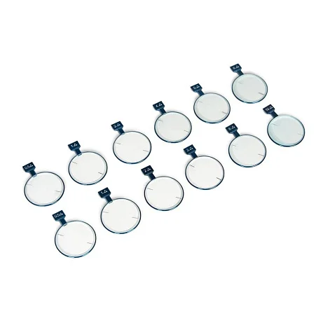 В комплекте собраны ключевые линзы и элементы, которые закрывают типовые сценарии диагностики и подбора очков. Линзы выполнены из бесцветного оптического стекла и установлены в индивидуальную металлическую оправу. Маркировка продумана для быстрого ориентирования в работе: номинальная оптическая сила нанесена на рукоятку, на ободках астигматических линз отмечено направление главного сечения нулевого действия, а на рукоятках дополнительных элементов — условные обозначения.