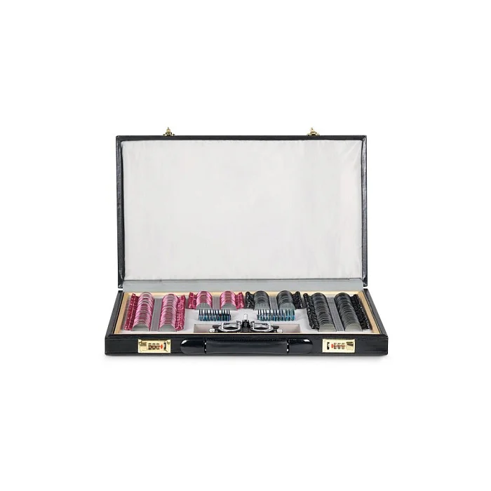 Набор размещен в специальном кейсе из кожзаменителя с тканевой обивкой внутри. В качестве запирающего устройства используется кодовый замок — актуально для кабинетов с высокой проходимостью и для выездной работы. Кейс дисциплинирует хранение: линзы не царапаются о случайные предметы, комплект выглядит аккуратно и профессионально, что всегда считывается пациентом.