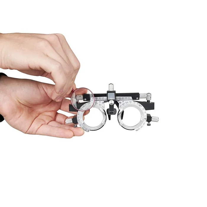 Универсальная пробная оправа изготовлена из металла и рассчитана на одновременную установку до 4 пар линз. Это удобно при подборе сложной коррекции и комбинированных проб: меньше перестановок, больше «чистой» диагностики. Размеры оправы — 150×95×45 мм.
