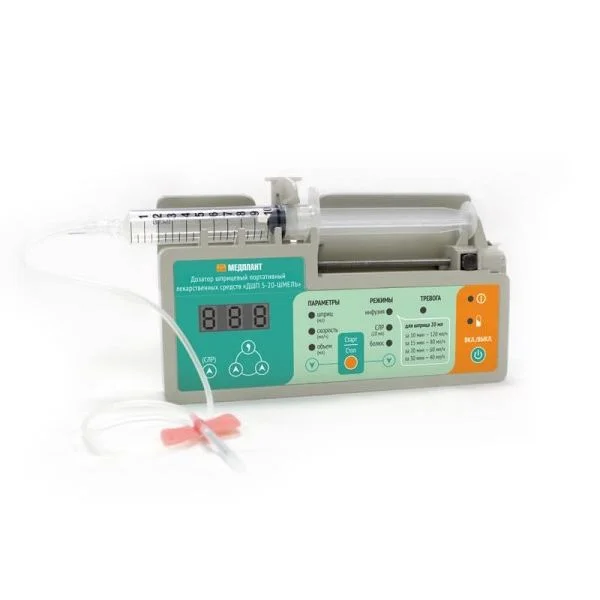 Насос шприцевой Медплант ДШП 5-20-Шмель — это портативный дозатор для точной дозировки лекарственных средств при введении пациенту в процессе инфузионной терапии.