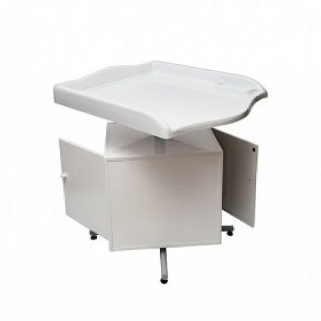 Столик обладает двухсторонней поворотной тумбой с дверцами и 2-мя полками из прочного пластика. Столешница производится из пластика с качественным акриловым покрытием. С 3-х сторон присутствуют бортики. Стол устанавливается на опорах, которые могут регулироваться по высоте. Оборудование обладает неразборной конструкцией.