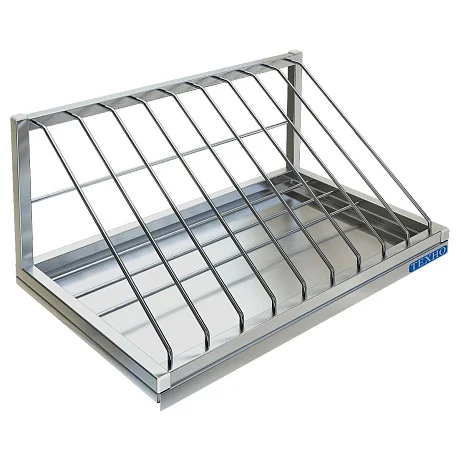 Надежная и практичная полка для профессиональной кухни — ставится над моечной ванной или рабочим столом, держит девять разделочных досок в порядке и на виду. Сделана из нержавейки AISI 304: каркас — труба 20×20 мм, секции разделены прутком Ø6 мм. Торцы труб закрыты заглушками, есть поддон для сбора стекающей воды и отверстие с вырезом «замочная скважина» для быстрой навески на стену. Поставляется полностью собранной — повесил и пользуйся.