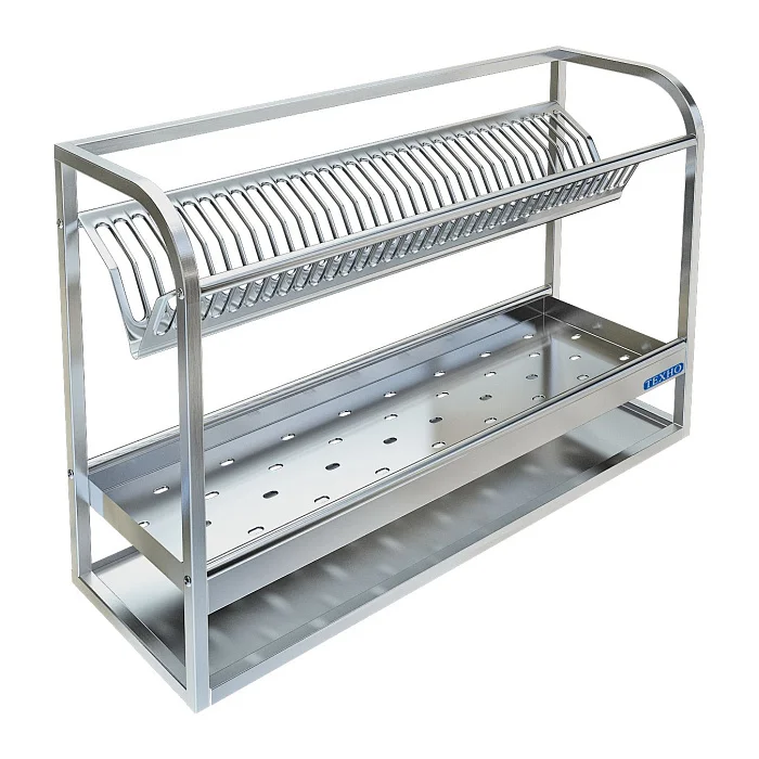 Настенная полка для сушки посуды ПН-328/900 — простой и надёжный помощник на кухне. Каркас и кассеты выполнены из нержавейки AISI 304 0,8 мм, поэтому полка не боится ни воды, ни пара. Двухуровневая кассета рассчитана на 35 тарелок, сама полка — с перфорацией под 50 стаканов; всё это аккуратно стекает в цельный поддон, который легко промывается. Боковины из трубы 20×20 добавляют жёсткости, при этом конструкция остаётся лёгкой и практичной. Поставляется собранной — повесил над мойкой или рабочим столом и пользуйся.