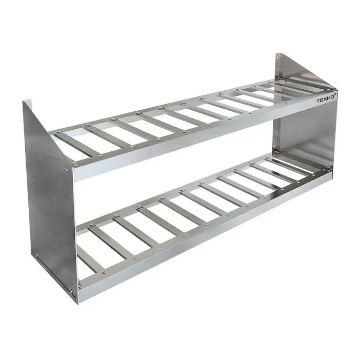 Прочная и простая в установке решетчатая полка из нержавейки AISI 304 толщиной 0,8 мм — идеальное решение для кухни или производства. Две полки на болтовых соединениях крепятся к стене с помощью боковых кронштейнов (можно установить кронштейн сверху или снизу), что даёт свободу компоновки и возможность штабелирования одна над другой. Поставляется в разобранном виде, рекомендована для монтажа на влагостойкие поверхности. Отлично подходит для хранения кухонного инвентаря и посуды в заведениях общественного питания.