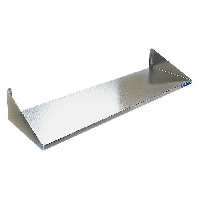 Практичная полка из пищевой нержавейки подходит для любого помещения. Цельный лист стали толщиной 0,8 мм уверенно держит вес, не прогибается под тяжёлой тарой или посудой.