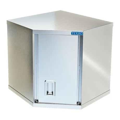 Держит угол кухни в порядке и не мешает работе повара. Цельносварной угловой шкаф с дверцей — практичное решение для хранения посуды, инвентаря, сухих продуктов и столовых приборов. Внутри одна полка; все контактные поверхности выполнены из пищевой нержавеющей стали AISI 304, задняя стенка — из оцинкованного металла. Крепится к стене при помощи кронштейнов; рекомендуется монтировать на влагостойкие основания.