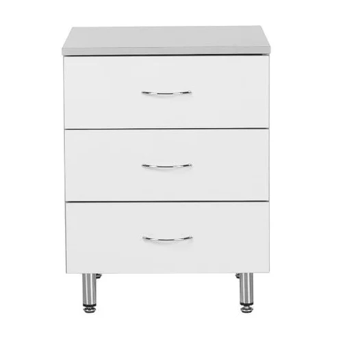 Прикроватная тумбочка из ЛДСП белого цвета на четырех хромированных металлических регулируемых ножках. Состоит из трех выдвижных ящиков на телескопических направляющих, позволяющих полностью выдвинуть ящик и закрыть его при полной загрузке. Вместительные и удобные ящики, тумбочка подойдет для хранения личных вещей. Эта прикроватная тумбочка продается в магазине МедМебель, специализированном производителе лаборантской и офисной мебели в Москве. В этом магазине выгодные цены на такую мебель и быстрая доставка.