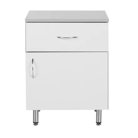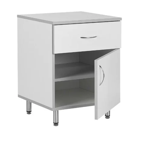 Прикроватная тумбочка из белого ЛДСП на хромированных регулируемых круглых ножках-опорах незаменима для использования в больничных палатах и медицинских кабинетах. В ней удобно хранить личные вещи благодаря большому отделению с полкой и закрывающей дверкой, а также выдвижному ящику с хромированной ручкой в верхней части тумбочки. Заказать прикроватную тумбочку лучше в магазине МедМебель, Москва. В этом магазине самые выгодные цены и быстрая доставка. Сотрудники магазина всегда на связи в рабочее время.