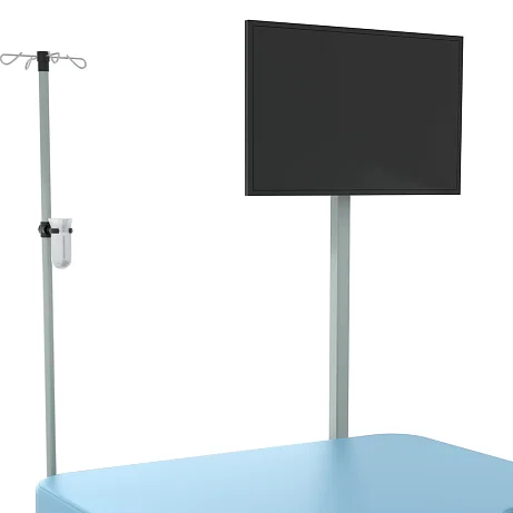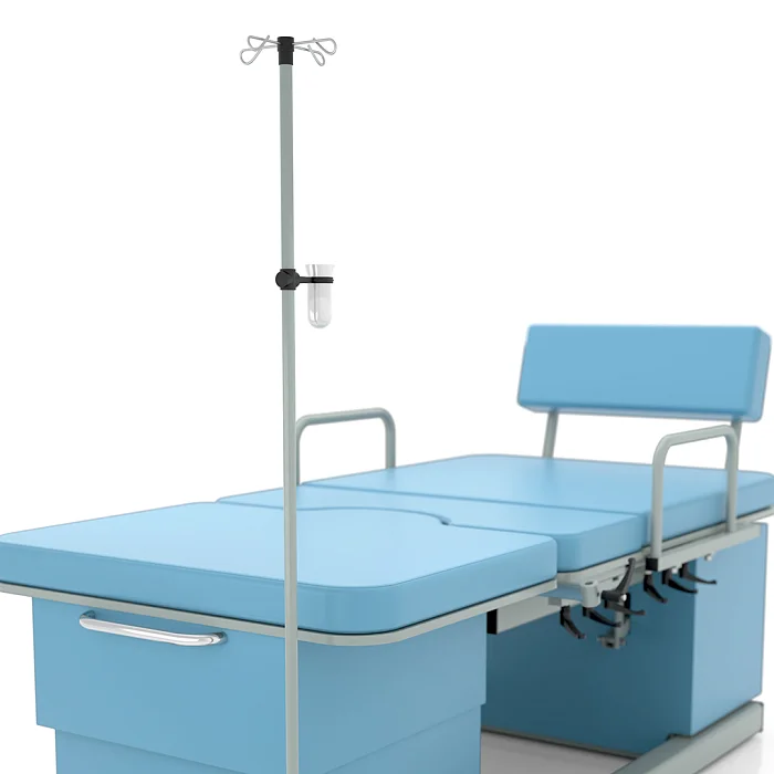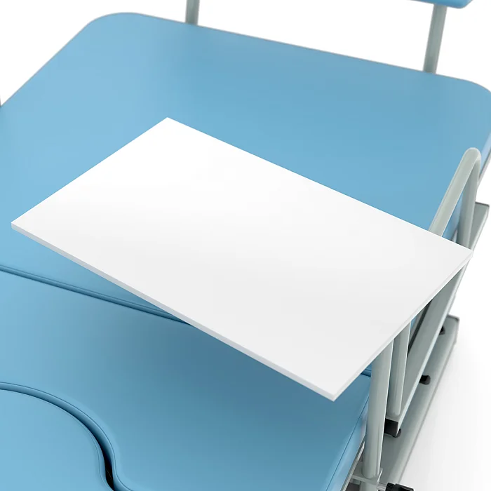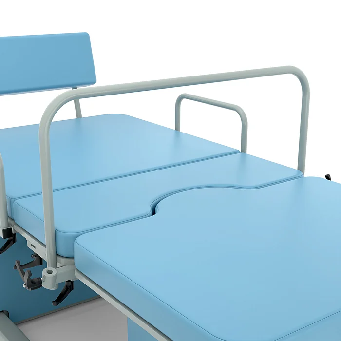 При необходимости кровать может быть дополнена полезными аксессуарами и элементами оснащения. Среди доступных опций — манипуляционный столик, держатель для моноблока, торцевое ограждение, упоры для ног, ручная секция, опорная дуга, инфузионная стойка, столик пациента, комплект боковых ограждений, водонепроницаемые чехлы и тележка для хранения принадлежностей. Благодаря такому набору дополнительных решений можно адаптировать модель под специфику конкретного родильного зала, операционной или смотрового кабинета.