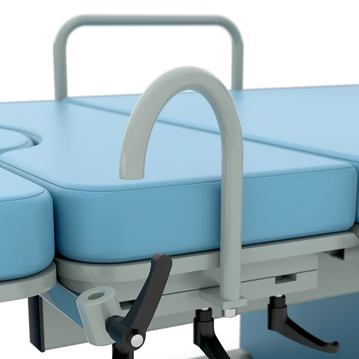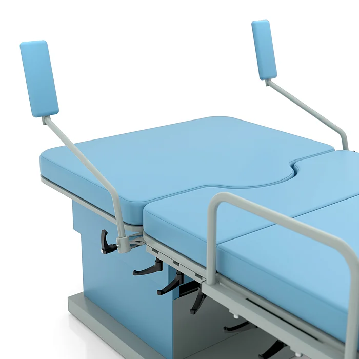 Опоры по Геппелю евро-образца изготовлены из полиуретана, регулируются по высоте и углу поворота, что помогает точнее настроить положение пациентки. Подколенники и ручки для пациента легко снимаются, благодаря чему кровать удобно использовать и в условиях операционной. На боковых поверхностях предусмотрены крепления для держателей, рукояток и дополнительного оборудования, поэтому модель легко адаптируется под требования конкретного отделения.