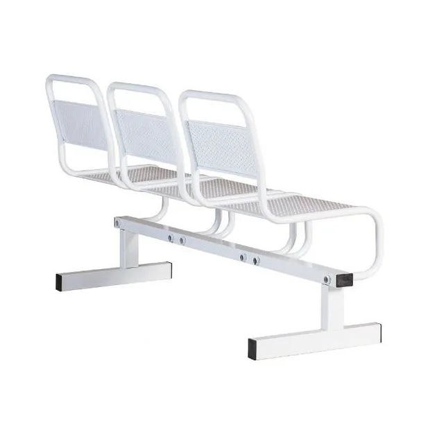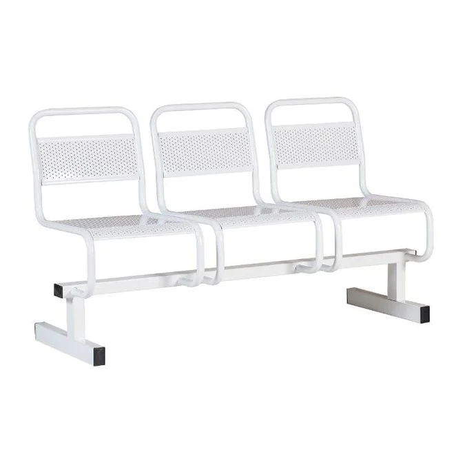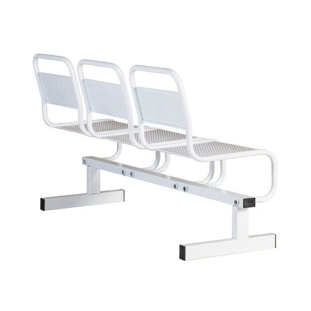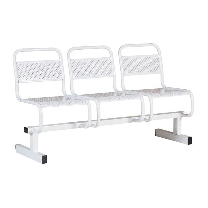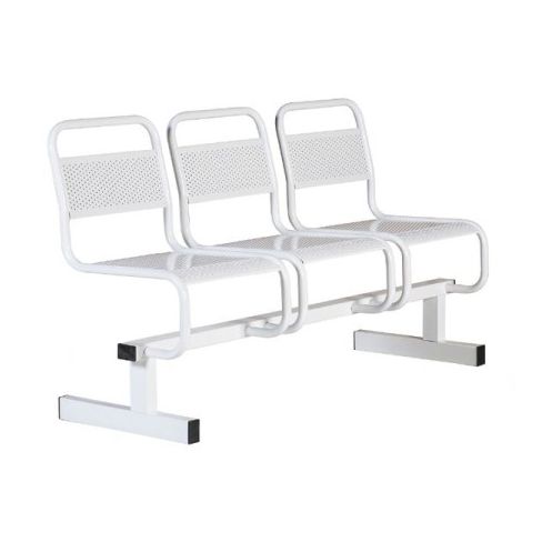 Стальная конструкция обладает 3-мя местами для сидения. Секция установлена на 2-х опорах. Сидения и спинки являются перфорированными. Они разделяются стальными трубами. При производстве секции использовались технологии, обеспечивающие изделию максимальную надежность. Металлические детали покрыты особым защитным слоем.