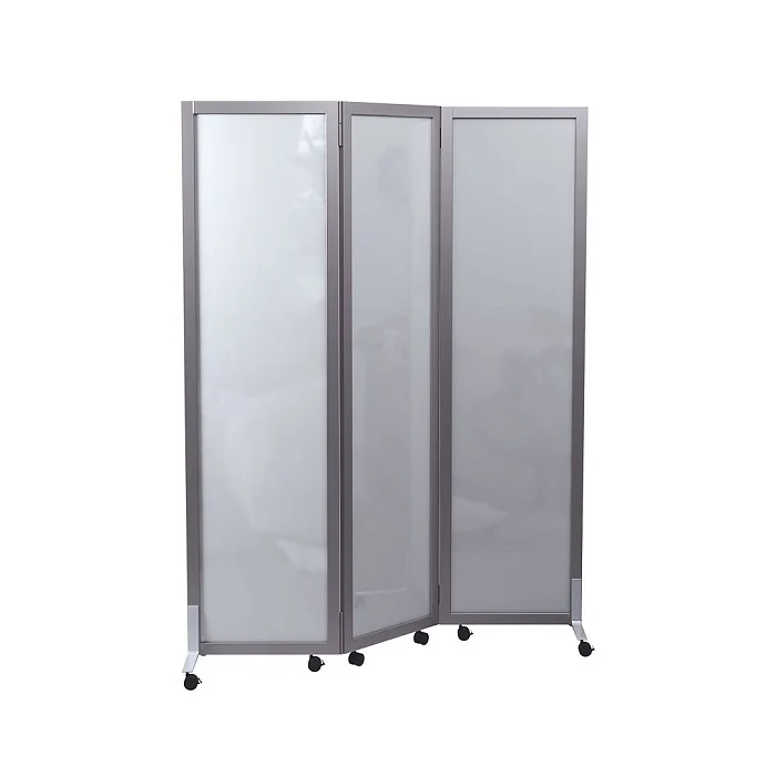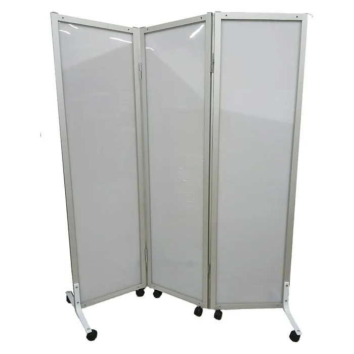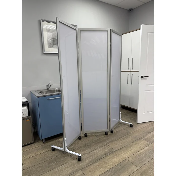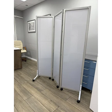 Основу каждой секции составляет прочная рамка из алюминиевого профиля толщиной 20 мм. Такой материал ценится за удачное сочетание надежности, малого веса и устойчивости к повседневным нагрузкам. Алюминиевый профиль не утяжеляет конструкцию, поэтому ширма остается удобной для регулярного перемещения персоналом.
