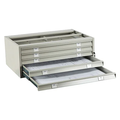 Шкаф для чертежей Практик А0-05/2 может использоваться в качестве промежуточной секции модуля и оснащается пятью выдвижными ящиками на телескопических направляющих. На шкафу установлен центральный ключевой замок. Ящики рассчитаны на хранение документов формата А0 и оснащены двумя разделителями и прижимной планкой, позволяющими размещать в них документации меньшего формата. Самая выгодная цена на шкаф для чертежей Практик А0-05/2 предложена в интернет-магазине МедМебель. Для заказа вам достаточно заполнить на сайте соответствующую форму. По Москве доступен сервис адресной доставки.