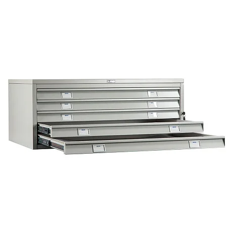 Шкаф для чертежей Практик A1-05/1 оснащен пятью широкоформатными ящиками, в которых можно хранить различные чертежи и карты формата A1. Может крепиться сверху к базовому модулю или промежуточной секции, образуя многоярусный шкаф. Ящики могут полностью выдвигаться, оборудованы телескопическими направляющими и центральным ключевым замом. Вы можете приобрести шкаф для чертежей Практик A1-05/1 по очень выгодной цене в магазине МедМебель. Для покупки шкафа достаточно на сайте заполнить предложенную форму заказа. Воспользуйтесь удобным сервисом доставки товаров по Москве курьерской службой.