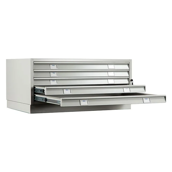 Шкаф для чертежей Практик A1-05/3 является нижней секцией модуля и может крепиться к базовому или промежуточному отделениям. Оснащен пятью выдвижными ящиками, в которых удобно размещать документацию формата А1. Ящики оборудованы телескопическими направляющими и центральным ключевым замком. Предусмотрены разделители, которые позволяют организовать в ящиках пространство для хранения документов форматов А3 и А4. Магазин МедМебель установил самую низкую цену на шкаф для чертежей Практик A1-05/3. На сайте можно без труда оформить заказ. Курьерская служба быстро доставит товар в любой район Москвы.