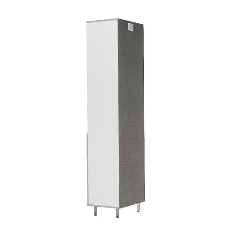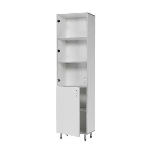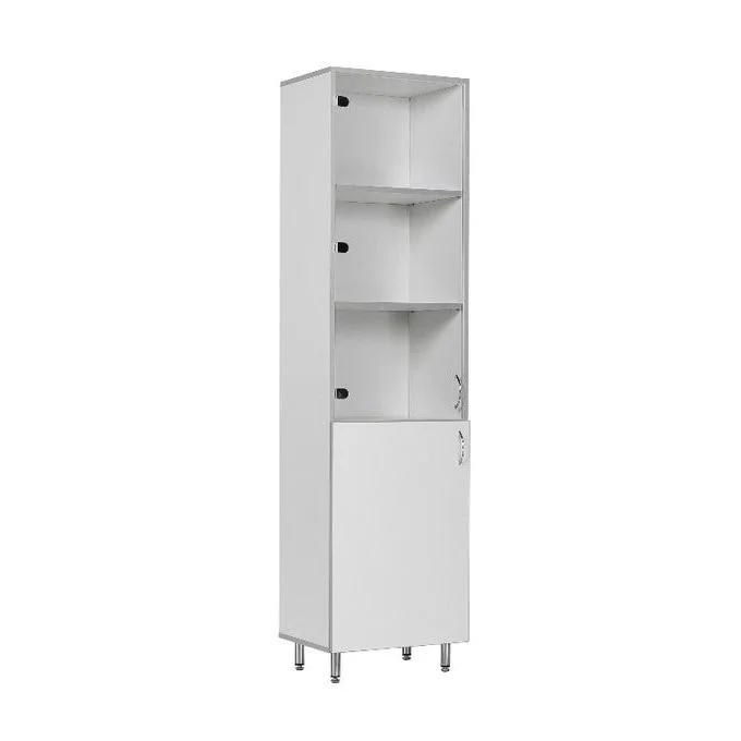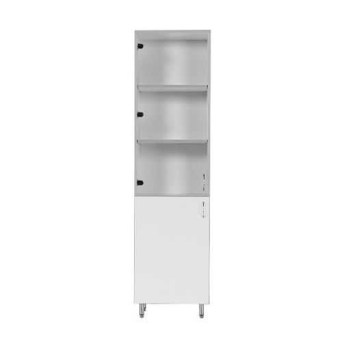 Белый шкаф на устойчивых хромированных металлических опорах с антикоррозийным покрытием содержит две части. Верхняя, с двумя съемными полками и стеклянной дверцей для хранения документации, и нижняя, с одной полкой и дверцей из ЛДСП. Эта модель шкафа комплектуется фурнитурой импортного производства. Поставляется в разобранном виде с инструкцией по сборке.