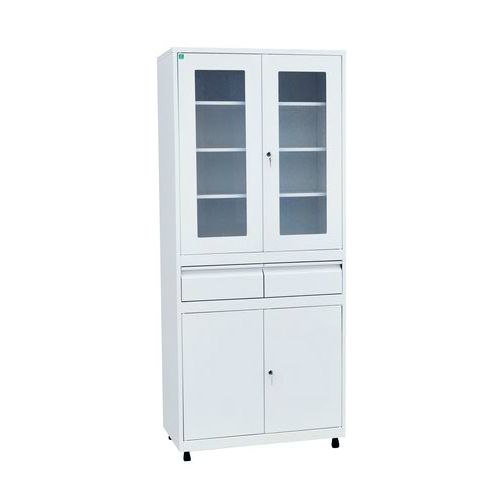 Удобно обставить рабочее место медработника поможет шкаф для кабинета врача ШКВ-03. Сочетание цены и качества этой медицинской мебели оптимально сочетаются. Практичная модель состоит из трех функциональных частей. Верхняя — это шкаф за двустворчатой дверью из стекла и металла. Закрывается это отделение на ключ. Средняя зона — это два выдвижных ящика. Под ними расположен шкаф под стальной дверью, на которую установлен такой же ключевой замок. Внутри одна полка, разделяющая пространство на отделы разного объема. Хранить в этом отделении можно медицинский инструмент и другие вещи с большими габаритами.