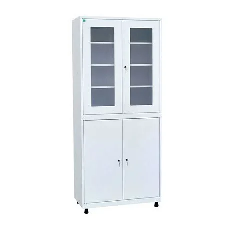 Вместительный и надежный шкаф для кабинета врача ШКВ-05 оснащен трейзером, в котором можно хранить самые важные документы, опасные препараты, деньги. Наш магазин предлагает эту практичную и высококачественную мебель по невысокой цене. Верхнее отделение — это пространство, разделенное тремя полочками. Этот отдел закрывается двустворчатой дверью из стекла и металла, на двери стоит ключевой замок. Нижнее отделение разделено на 6 ячеек, в которых можно хранить различные категории медикаментов, документов или инструментов. В этом же отделении установлен трейзер с замком повышенной секретности.