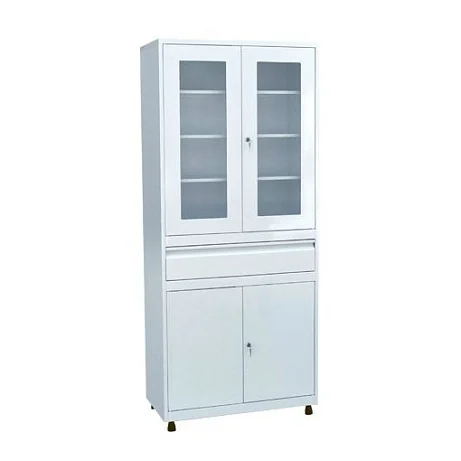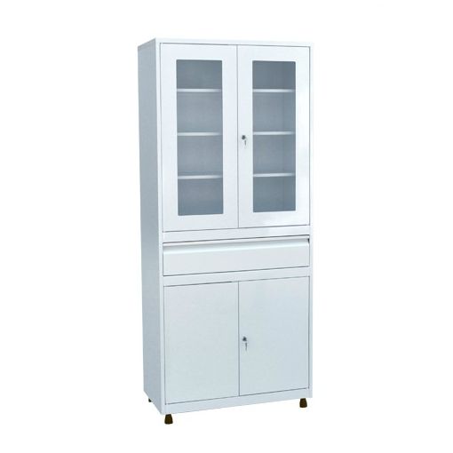 Функциональный шкаф для кабинета врача ШКВ-07 включает несколько отделений, которые можно использовать для хранения разных предметов. Нижнее отделение закрывается металлической дверью, которая запирается на ключ. В центральной части — выдвижной ящик широкий, но не глубокий. Верхний отдел закрывается на прозрачную стеклянную дверь в металлической рамке. Дверь этого отделения также оснащена ключевым замком. Такое разделение шкафа на функциональные части позволяет хранить в порядке и отдельно друг от друга предметы разного назначения.
