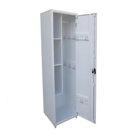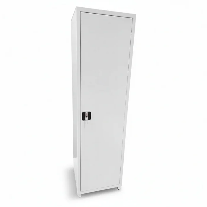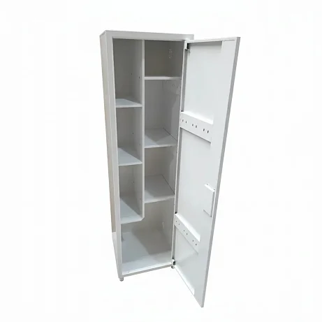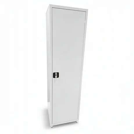 Шкаф однодверный, с металлической дверью размером 432×1679 мм. Закрывание — на ригельный замок, что актуально для помещений, где требуется ограничить доступ к хозяйственным средствам. Угол открывания двери 100° — этого достаточно, чтобы комфортно доставать коробки, канистры в таре или комплектующие, не упираясь в корпус и не «выкручивая» руки.
