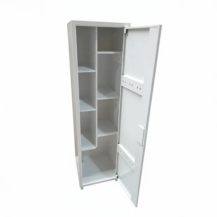 Корпус выполнен из листовой стали толщиной 1,0 мм — это оптимальный баланс между жесткостью конструкции и разумным весом. Внутри шкаф разделён на два отделения, каждое с тремя полками. При такой компоновке получается понятная «логика хранения»: слева — компактная секция под мелкие и средние принадлежности, справа — более гибкая зона, где можно адаптировать пространство под текущие задачи.
