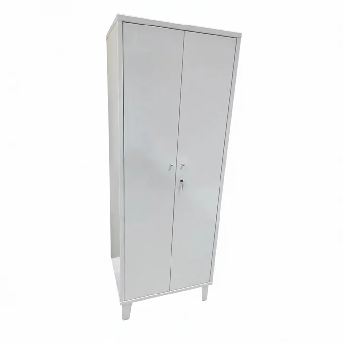Металлические двери закрываются на замок; в комплекте идут два ключа. Для повседневного удобства установлены ручки-кнопки. Корпус выполнен из листовой стали толщиной 1,0 мм и окрашен белым порошковым полимерным покрытием, которое хорошо подходит для помещений с регулярной уборкой.
