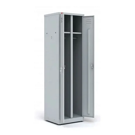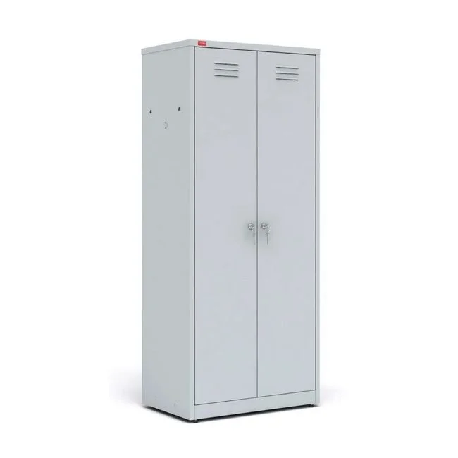 ПАКС металл ШРМ-АК представляет собой шкаф для хранения одежды и прочих личных вещей. Модель может использоваться для оснащения гостиниц, предприятий, санитарно-лечебных учреждений. Корпус двухстворчатого шкафа выполнен из листовой стали, на которую нанесено полимерное покрытие марки Bihon. В конструкции два отделения, в каждом из них предусмотрена съемная полка для головных уборов, два крючка для вешалок и перекладина для вешалок. Дверцы оборудованы ключевым замком.