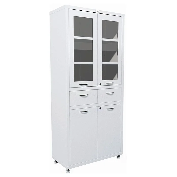 При необходимости хранить большие объемы документации, медицинских препаратов и инструментов хорошо подойдет шкаф HILFE МД 2 1780 R-1. Верхний отдел шкафа закрывается на двустворчатую дверцу со стеклянной вставкой, в центре расположены два выдвижных ящика, а внизу — отделение с полочками, закрывающееся на стальную двустворчатую дверцу. На всех стальных полочках шкафа можно хранить предметы, масса которых достигает 30 кг. Максимальная допустимая нагрузка на ящик — 20 кг. На дверцах стоят замки, открываемые ключами. Эта практичная модель в нашем магазине продается по доступной цене. При этом нами осуществляется быстрая доставка, за самый короткий период привозится оборудование в Москве. Прямо сейчас обращайтесь к нам, чтобы оформить заказ на шкаф!
