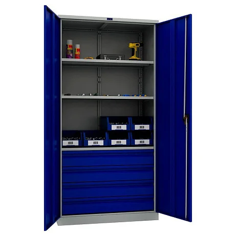 В шкафу инструментальном TC-1995-003040 установлено три съемных полки, регулирующихся по высоте, и четыре выдвижных ящика, устанавливаемых на телескопических направляющих. Пользователь сам может упорядочивать размещение элементов внутри шкафа. При необходимости полка или ящик могут быть сняты. На дверях установлен ключевой замок с ручкой. Самая низкая цена на шкаф инструментальный TC-1995-003040 предложена в интернет-магазине МедМебель. На сайте вы можете за несколько минут заполнить форму заказа, и курьер быстро доставит приобретенный товар по указанному адресу в Москве.