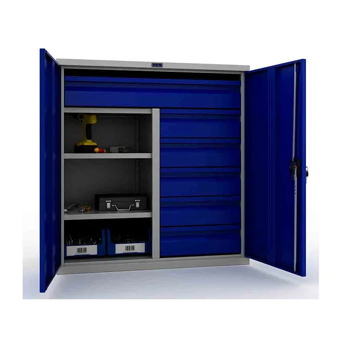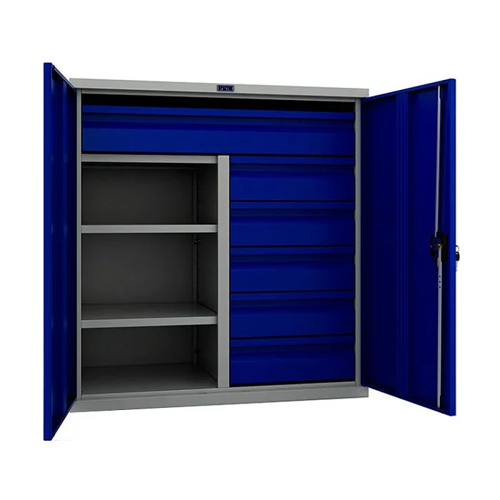 Шкаф инструментальный ТС 1095-100215 комплектуется пятью небольшими выдвижными ящиками и одним большим ящиком, установленным на телескопических направляющих. Кроме этого, изделие оснащается двумя полками и перегородкой. Шкаф поставляется в разобранном виде, и его конструкция позволяет производить сборку самостоятельно и размещать элементы в удобных местах. На дверях устанавливается ключевой замок с ручкой. Если не хотите переплачивать за шкаф инструментальный ТС 1095-100215, то сделайте заказ на его поставку в интернет-магазине МедМебель. Мы предлагаем товары по самым доступным ценам. По Москве товары развозит служба доставки.