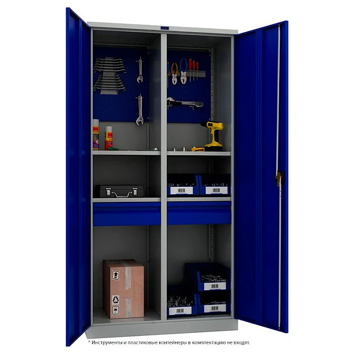 Шкаф инструментальный ТС 1995-120402 разделен перегородкой на два вертикальных отделения. Изделие комплектуется двумя небольшими выдвижными ящиками, оснащенными телескопическими направляющими, четырьмя малыми полками и двумя экранами с перфорацией, на которых крепятся держатели для инструментов и ключей, а также маленькие полочки для принадлежностей. На дверях шкафа установлен ключевой замок. Выгодно приобрести шкаф инструментальный ТС 1995-120402 можно в магазине МедМебель. Мы установили самую доступную цену на товары. На сайте достаточно заполнить форму заказа, и товар быстро будет доставлен в любую точку Москвы курьерской службой.