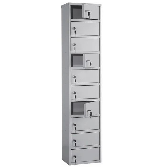 Шкаф кассира Практик AMB-140/10 выполнен в форме пенала с десятью ящиками, расположенными каскадом. Каждая ячейка оборудована отдельно дверцей с ключевым замком. В шкафу можно размещать для временного хранения пломбиры, печати и личные деньги кассиров. Изделие может фиксироваться к стене при помощи специальных креплений. Приобретая шкаф кассира Практик AMB-140/10 в интернет-магазине МедМебель, вы платите самую приемлемую цену за товар высокого качества. Для заказа шкафа достаточно заполнить на сайте специальную форму. Обязательно воспользуйтесь услугой адресной доставки, которая доступна в пределах Москвы.