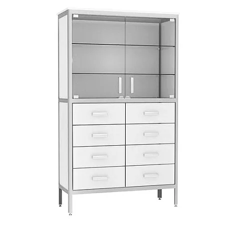 Верхнее отделение шкафа лабораторного АСК ШЛ.02.06 закрывается на двухстворчатую стеклянную дверь и оборудовано двумя полками из стекла. Нижнее отделение представляет собой два ряда выдвижных ящиков. Общее количество ящиков 8 штук. Каркас выполнен из алюминиевого профиля. В качестве обшивки используется ЛДСП. Ножки шкафа регулируются по высоте с помощью опор. Купить шкаф АСК ШЛ.02.06 по самой выгодной цене можно в магазине МедМебель. Сделайте заказ на сайте прямо сейчас. Доставка в любую точку Москвы курьерской службой.