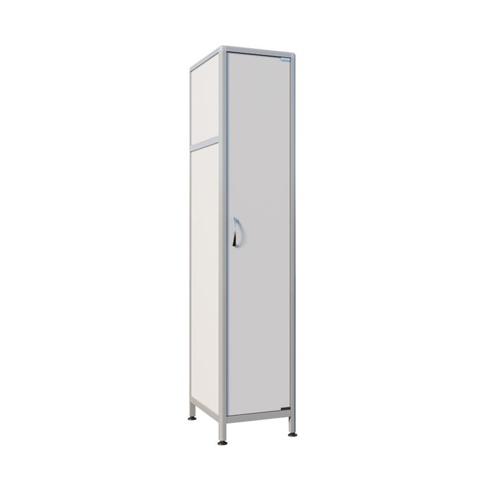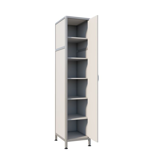 Основные особенности данной модели включают в себя вместительность при компактных размерах, что позволяет экономно использовать пространство. Алюминиевый профиль каркаса покрыт порошковой краской, обеспечивая долговечность и защиту от повреждений. Регулируемая высота ножек позволяет устанавливать шкаф на неровных поверхностях, обеспечивая стабильность.