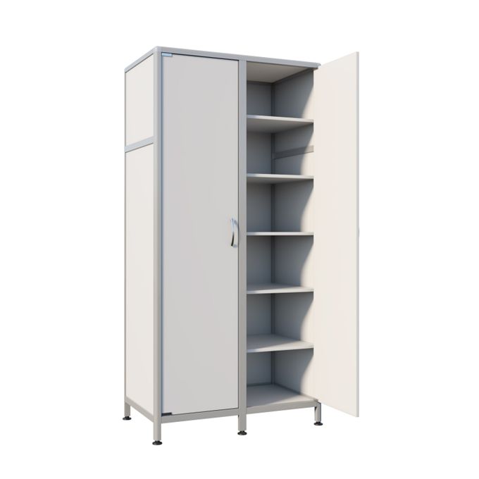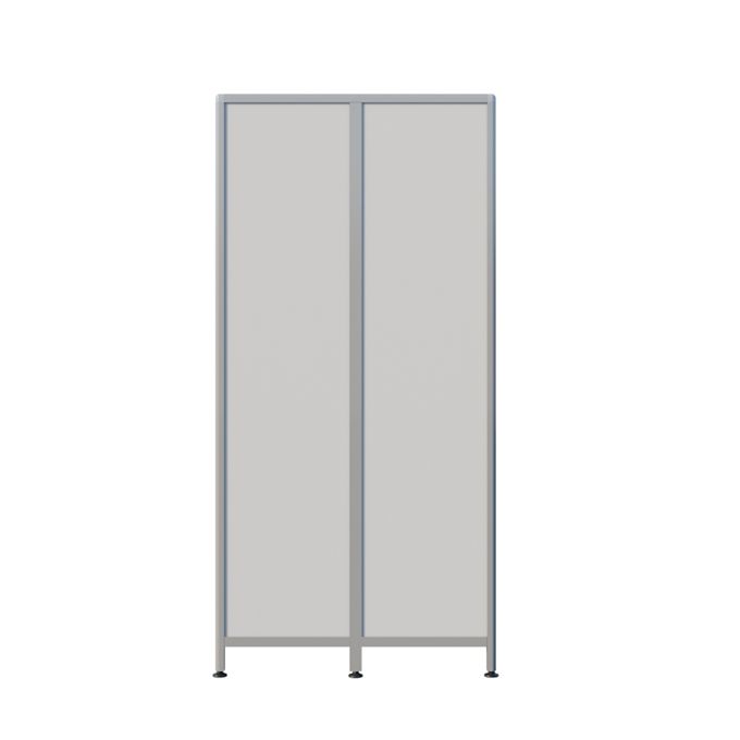 Шкаф имеет регулируемые ножки, что обеспечивает стабильность при установке на неровные поверхности, а покрытый порошковой краской алюминиевый профиль каркаса защищен от коррозии и внешних воздействий. Декорированный профиль на углах придает шкафу изысканный вид, а разделенная на отделения ниша облегчает организацию и размещение вещей.
