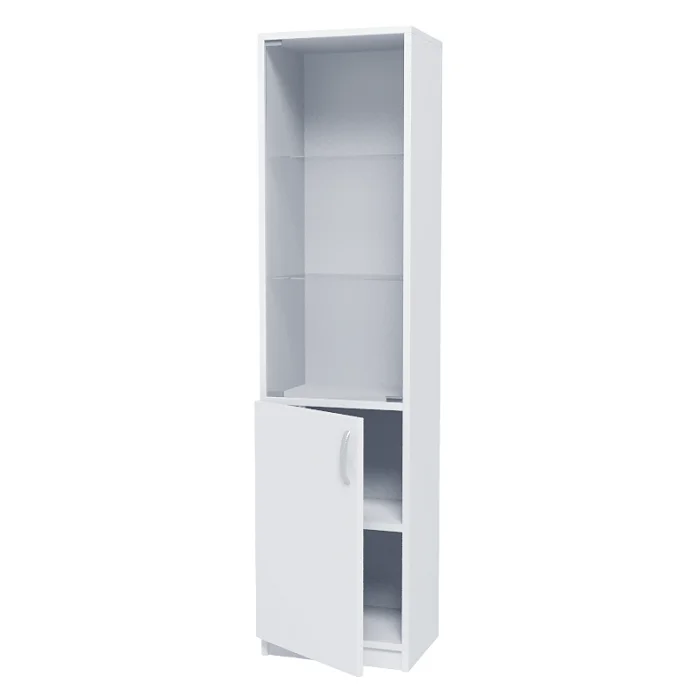 Шкаф МД-510 – стильный и функциональный элемент для организации пространства в медицинском учреждении, вашем доме или офисе. Изготовленный из долговечной ламинированной ДСП толщиной 16 мм, он предлагает два отделения для удобного хранения. Верхнее отделение с изящной стеклянной дверцей и двумя стеклянными полками идеально подходит для демонстрации содержимого, добавляя нотку элегантности в интерьер. Нижнее отделение с дверцей и полкой из ДСП обеспечит надежное хранение документов или вещей, создавая порядок и уют в вашем пространстве.